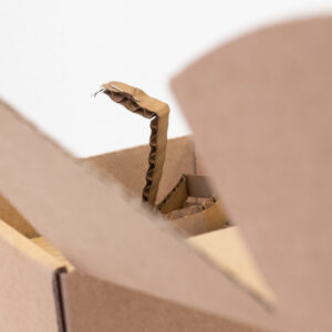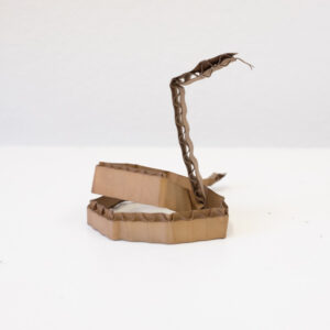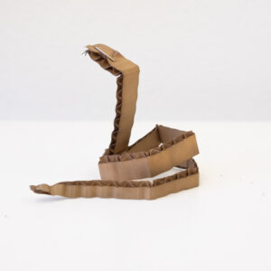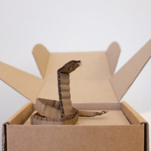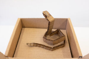 An animal model arrived in David’s box. In contrast to the scaly, colourful giant boas we knew from him, this one was doubly irritating: a little snake curled up quite inconspicuously on the bottom of the box because it was made of brown corrugated cardboard. And that in turn is a fake – in the most beautiful jewellery art of nobly patinated silver and white gold.
