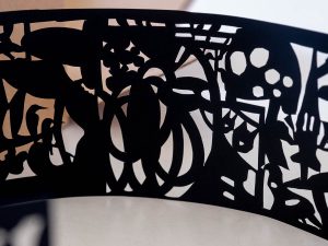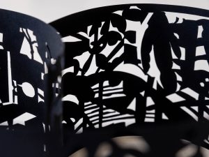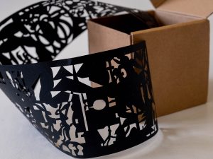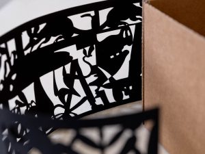 The black ribbon of finely cut cardboard that unrolls out of the box gets longer and longer. Like Little Red Riding Hood in the dark forest, you slowly and little by little discover what is growing there and who is hanging around. They emerge from the tangle of fine passages, slits and openings, the creatures of the forest and old fairytale books: fox, mouse and rabbit, mushrooms, woodpecker and owl, crocodile and little dwarf in the thicket. A touching mix of magical images, admiration of nature and sometimes spooky childhood dreams.