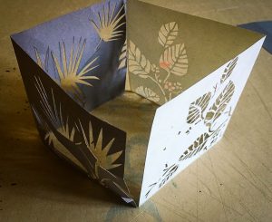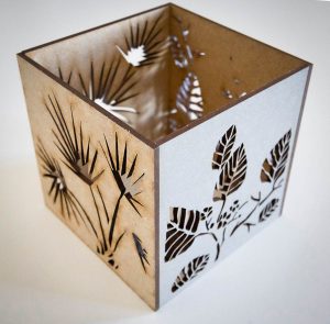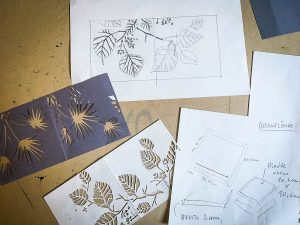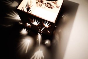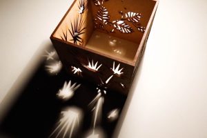 The theme of my box is the interconnectivity and fragility of nature. The small box shows on one side the contours of linden trees … typical trees from Berlin, on the other side there’re palm trees that could grow in warm latitudes. By the incidence of light … which symbolizes the warmth or the sun, shadows are created, which merge and oscillate the shapes of the two tree species. It’s a hint that climates are going crazy and adapting more and more over time. Will there be ‘Under the Palms’ instead of linden trees in Berlin in 20 years?” Yi Meng Wu / October 29, 2021