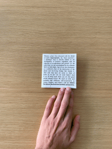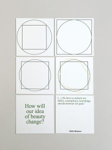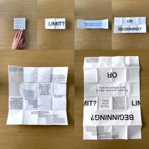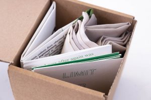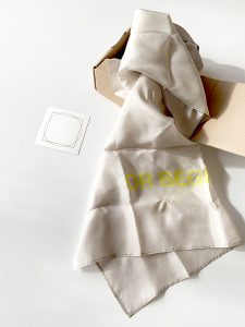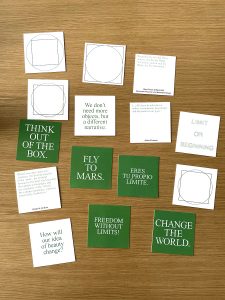The box from Barcelona contained a mix-set: expressed in a product-related manner, a silk banner with a colored screen-printed motif measuring 60 x 85 cm, a folding poster and 16 square text cards appeared.